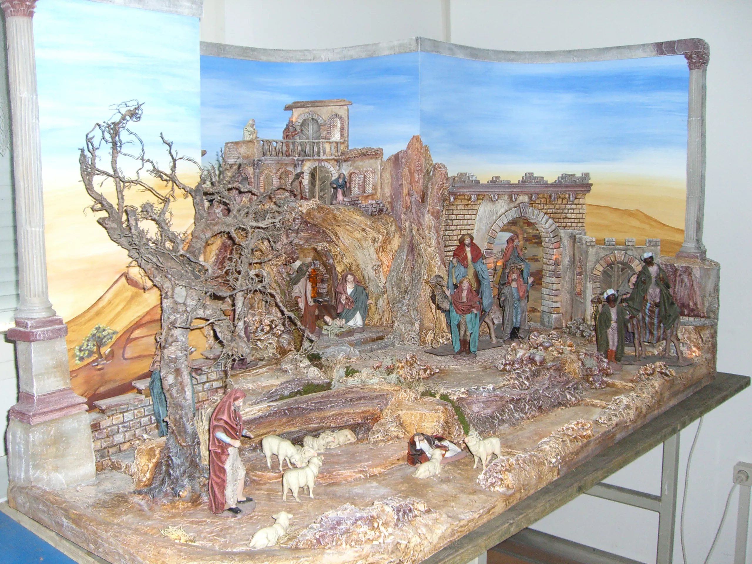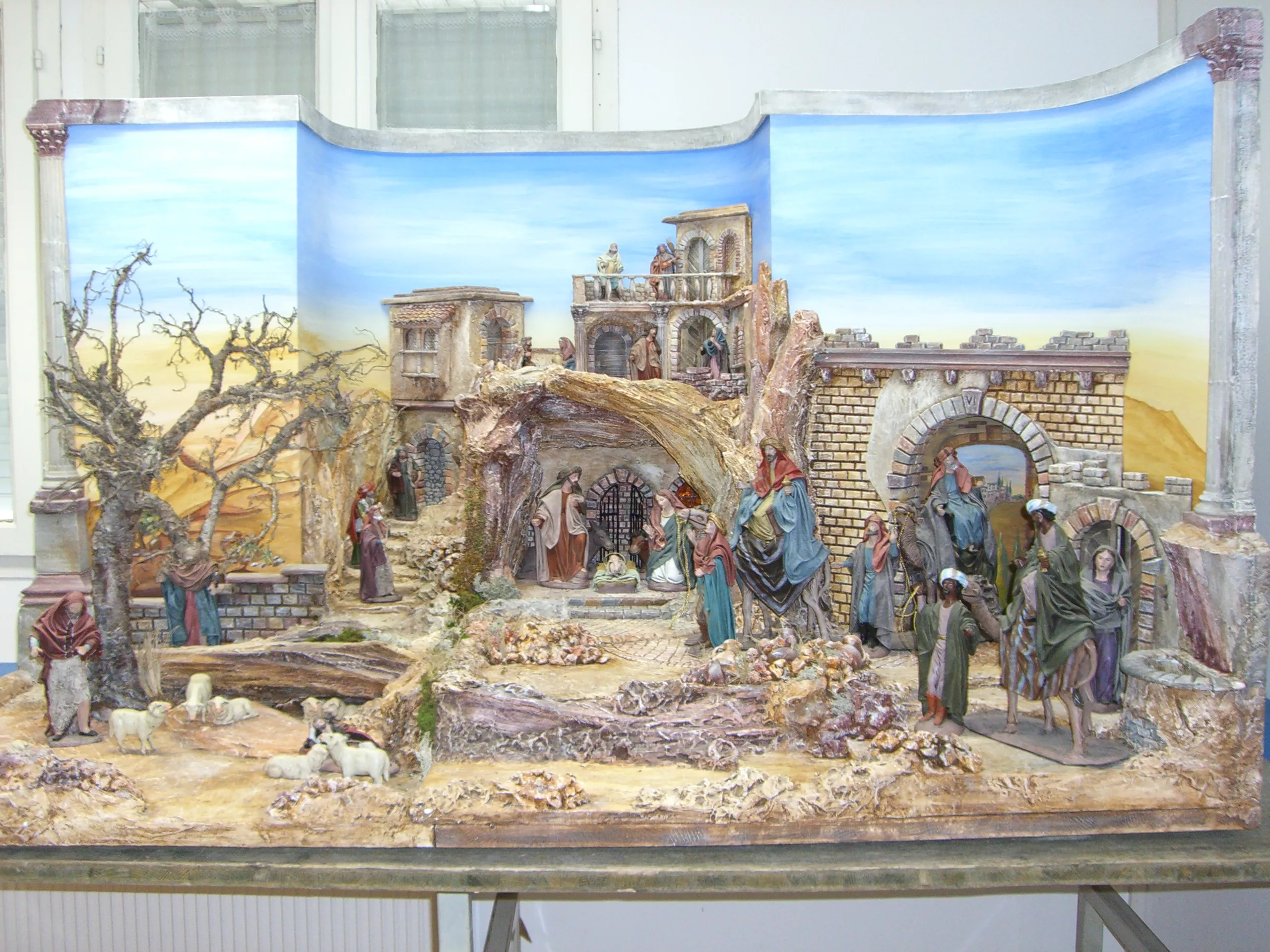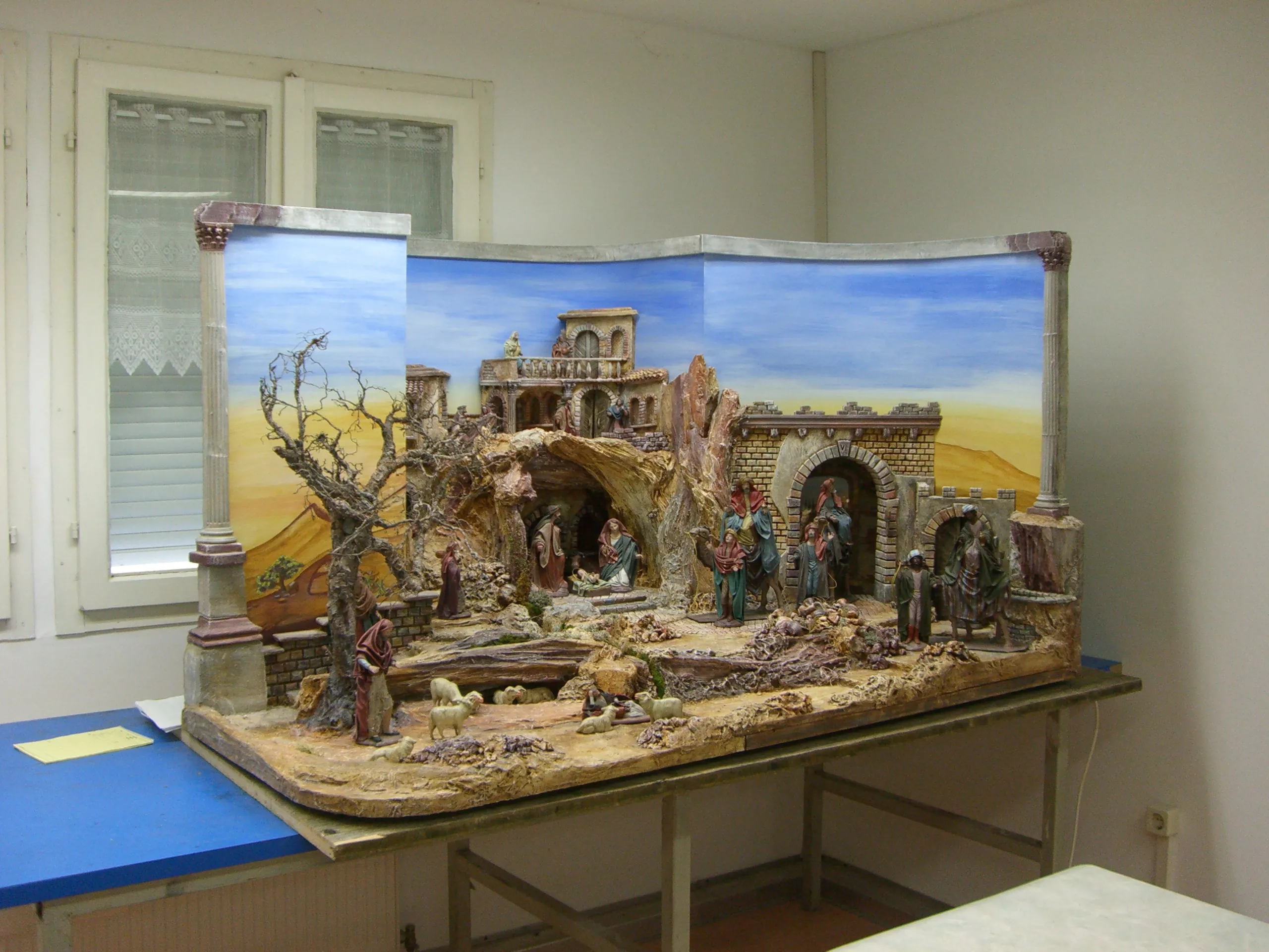 Die Krippe in Form eines Hauses, einer Höhle, eines Tempels, etc. steht auf einem Brett.