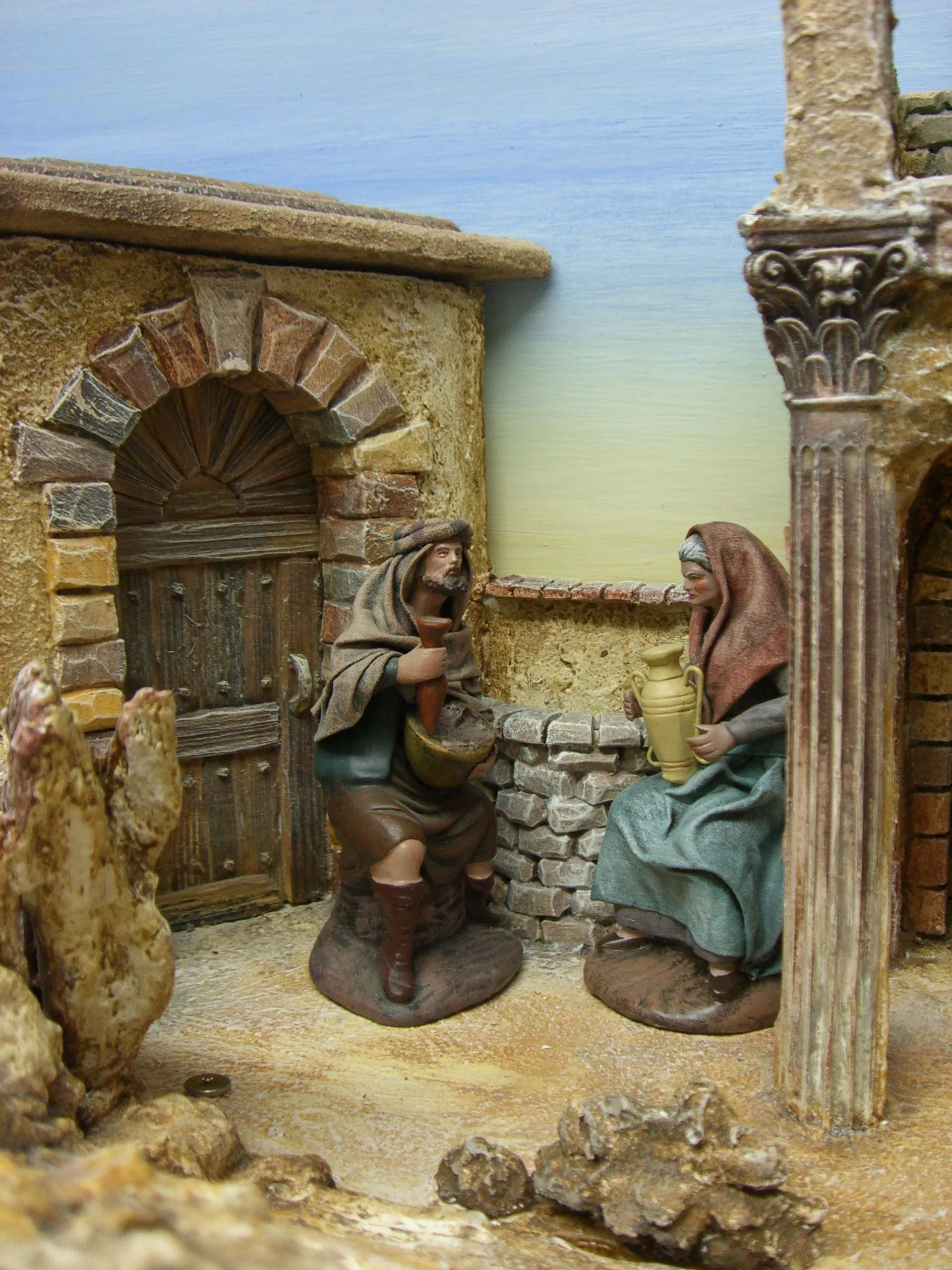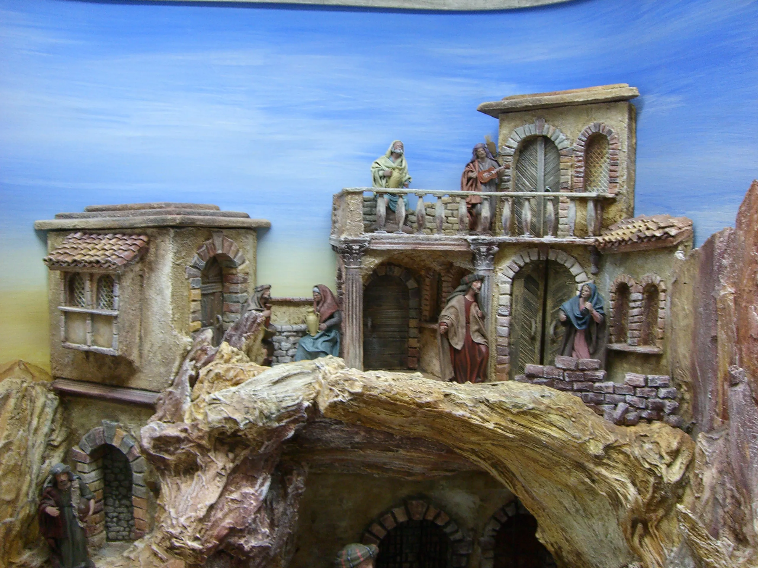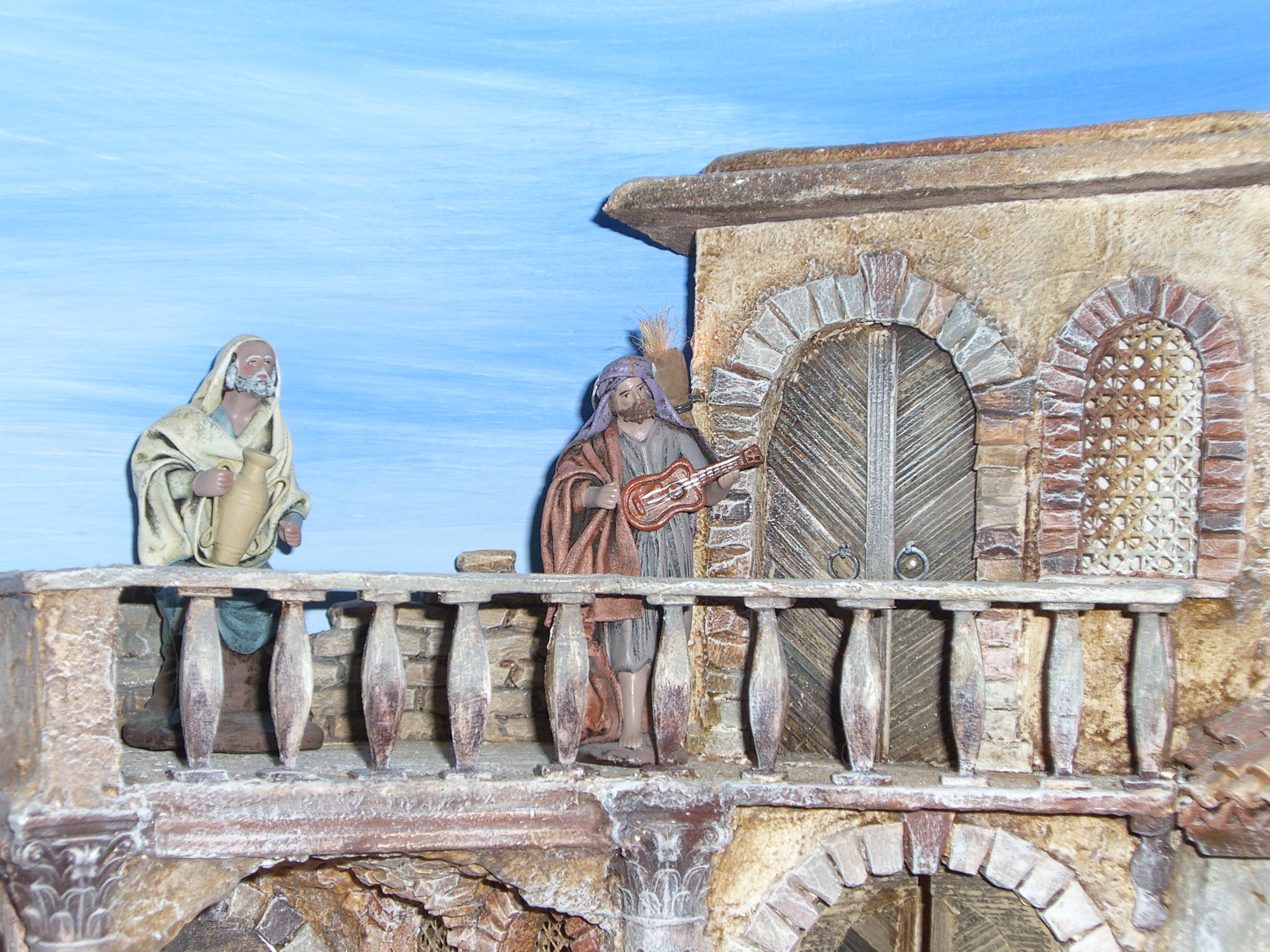 Die Krippe in Form eines Hauses, einer Höhle, eines Tempels, etc. steht auf einem Brett.